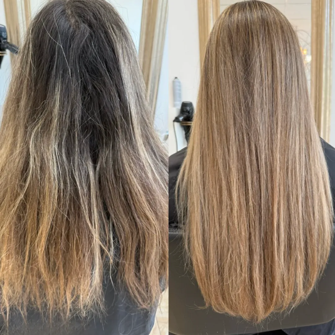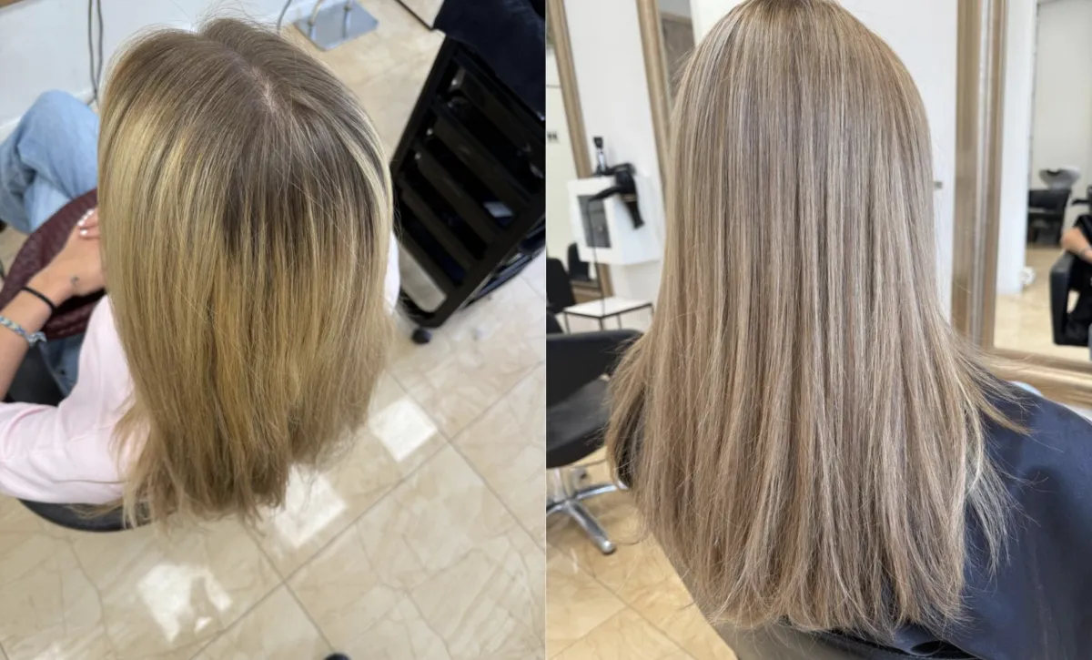 Efteråt tonar vi nyansen för bästa resultat, och avslutar med styling så att du lämnar salongen med ett fräscht och glänsande hår.